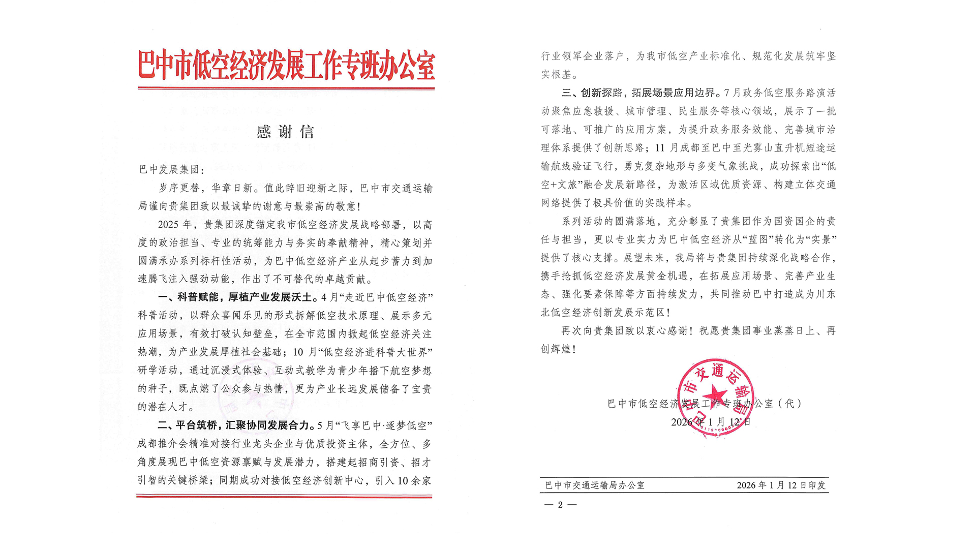近日,巴中發(fā)展控股集團(tuán)有限公司收到來自巴中市低空經(jīng)濟(jì)發(fā)展工作專班辦公室和巴中市油氣大會(huì)戰(zhàn)攻堅(jiān)組辦公室的感謝信。信中對2025年巴中發(fā)展集團(tuán)積極支持低空經(jīng)濟(jì)產(chǎn)業(yè)和推動(dòng)油氣產(chǎn)業(yè)高質(zhì)量發(fā)展表示感謝。